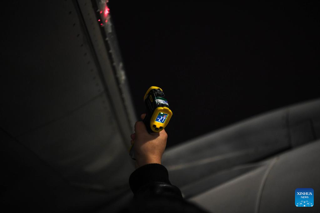 A maintenance worker of China Southern Airlines measures the temperature of an aircraft component at Guiyang Longdongbao International Airport in Guiyang, southwest China's Guizhou Province, Jan. 17, 2023. To ensure flight safety during the Spring Festival travel rush, aircraft maintenance workers have been working late hours to perform aircraft de-icing and anti-icing of aircrafts at Guiyang Longdongbao International Airport amid the cold weather. (Xinhua/Yang Wenbin)