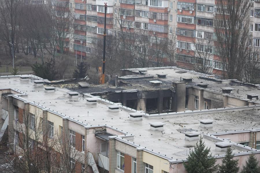 This photo taken on Jan. 18, 2023 shows the crash site of a helicopter in Brovary, a town in the suburbs of Kiev, Ukraine. (Photo by Roman Petushkov/Xinhua)