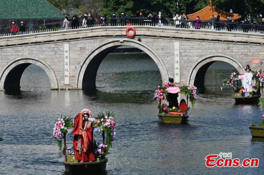 Young women dressed in traditional Hanfu costume take part in a cruise parade during the 13th water flower market, a unique tradition during China's Spring Festival in Liwan district of Guangzhou, south China's Guangdong Province, Jan. 18, 2023. (Photo: China News Service/Chen Chuhong)