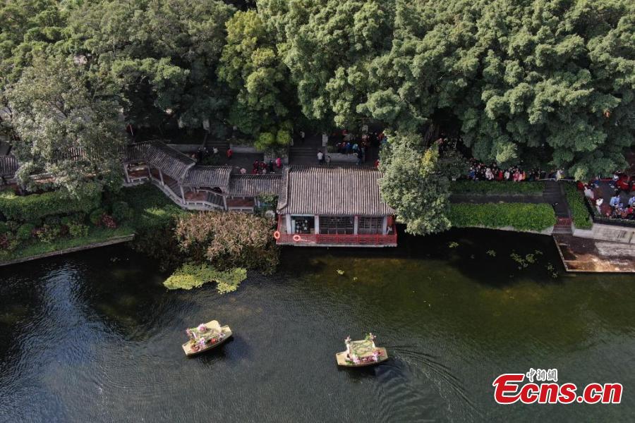 Young women dressed in traditional Hanfu costume take part in a cruise parade during the 13th water flower market, a unique tradition during China's Spring Festival in Liwan district of Guangzhou, south China's Guangdong Province, Jan. 18, 2023. (Photo: China News Service/Chen Chuhong)
