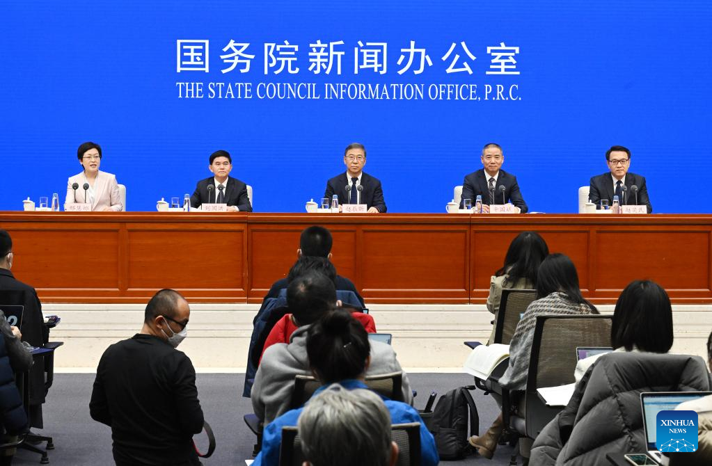 Deputy Director of the National Development and Reform Commission Zhao Chenxin (C, back), Vice Minister of Industry and Information Technology Xin Guobin (2nd R, back), Vice Minister of Natural Resources Liu Guohong (2nd L, back), Vice Minister of Ecology and Environment Zhao Yingmin (1st R, back), and spokesman of the State Council Information Office attend a press conference introducing a white paper titled "China's Green Development in the New Era" issued by the State Council Information Office in Beijing, capital of China, Jan. 19, 2023. The white paper aims to present a full picture of China's ideas, actions, and achievements in green development in the new era, and to share with the world its experience in this regard. (Xinhua/Li He)
