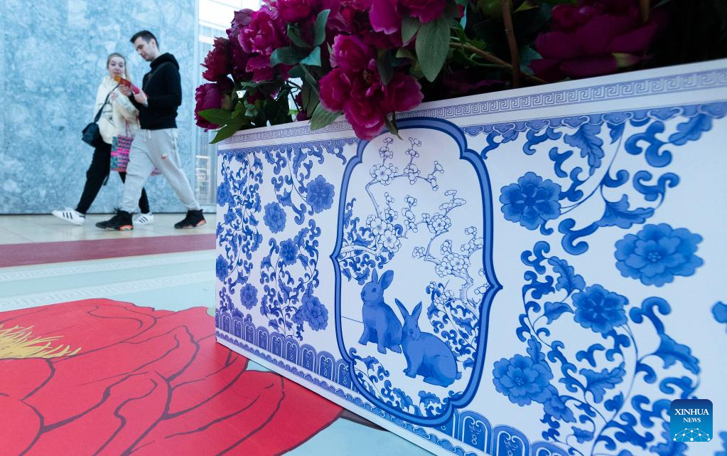 People walk through an art installation marking the upcoming Chinese Lunar New Year of the Rabbit at a shopping center in Toronto, Canada, on Jan. 18, 2023. The Chinese Lunar Year of the Rabbit begins on Jan. 22, 2023. (Photo by Zou Zheng/Xinhua)