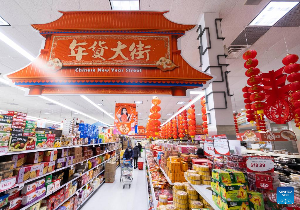 Customers shop at a Chinese supermarket with decorations marking the upcoming Chinese Lunar New Year of the Rabbit at a shopping center in Toronto, Canada, on Jan. 18, 2023. The Chinese Lunar Year of the Rabbit begins on Jan. 22, 2023. (Photo by Zou Zheng/Xinhua)