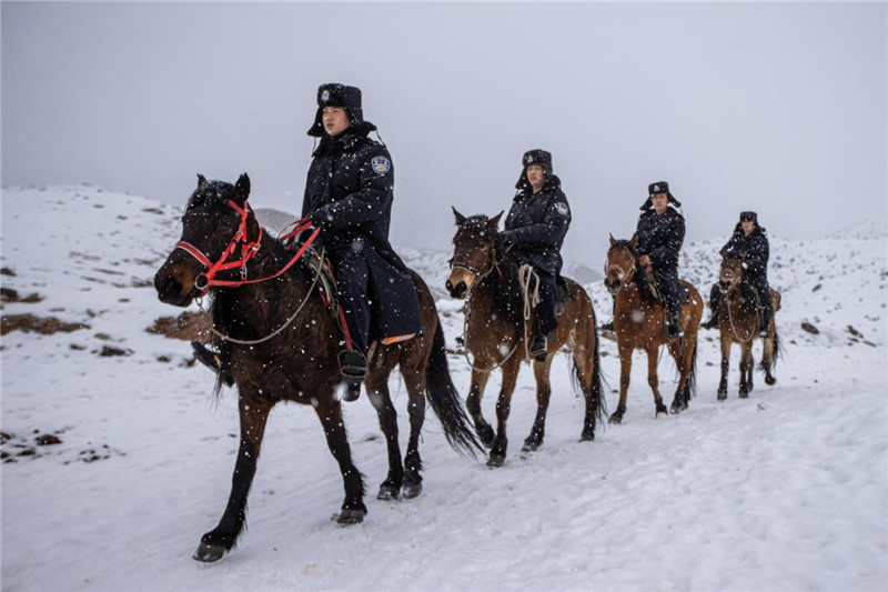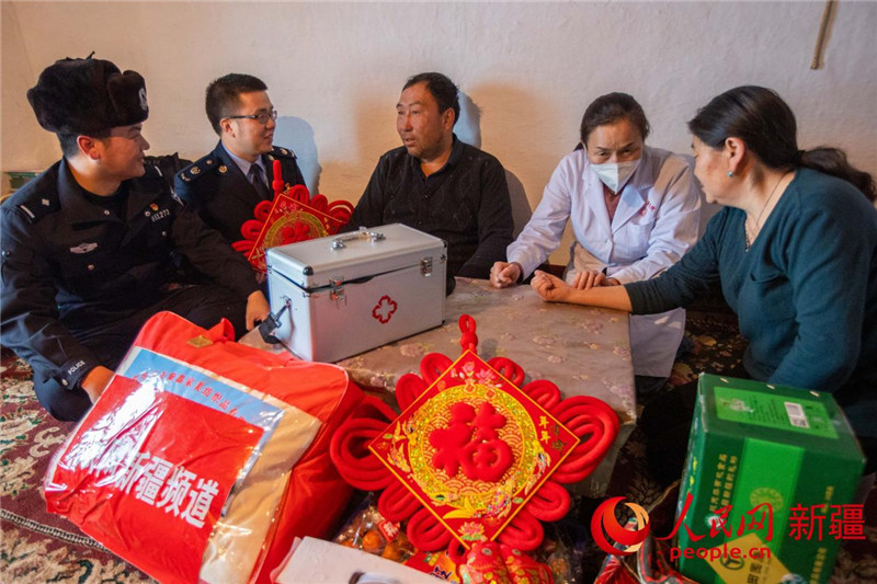The family of Zhong Hua, a herdsman, has received epidemic control materials, daily necessities, and medical services delivered by the service team and a team from the Xiaoyingpan border police station. Team members rode horses to visit Zhong as snow prevented vehicles from reaching the herdsman’s home.