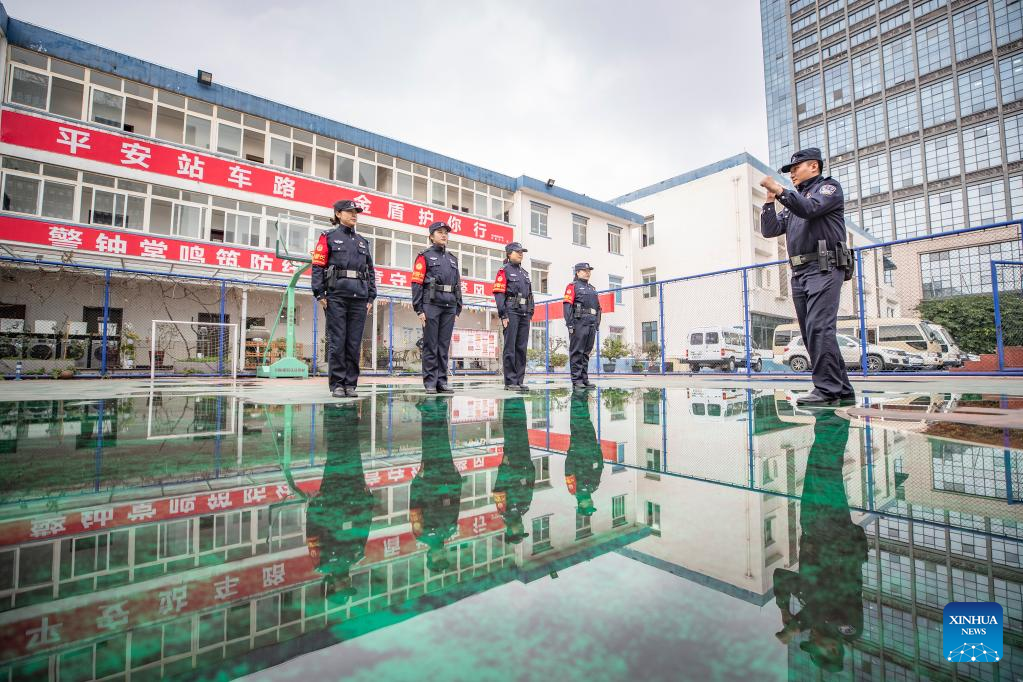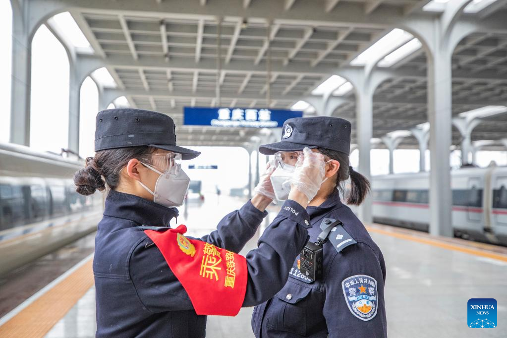 The "Fanghua" female railway police unit of Chongqing railway police office consists of seven female police officers with an average age of 29. They are responsible for some passenger trains from Chongqing to Xi'an. During the 40-day Spring Festival travel rush, also known as "chunyun," each member of the unit would work on the train with a travel mileage of about 40,000 kilometers. (Xinhua/Huang Wei)