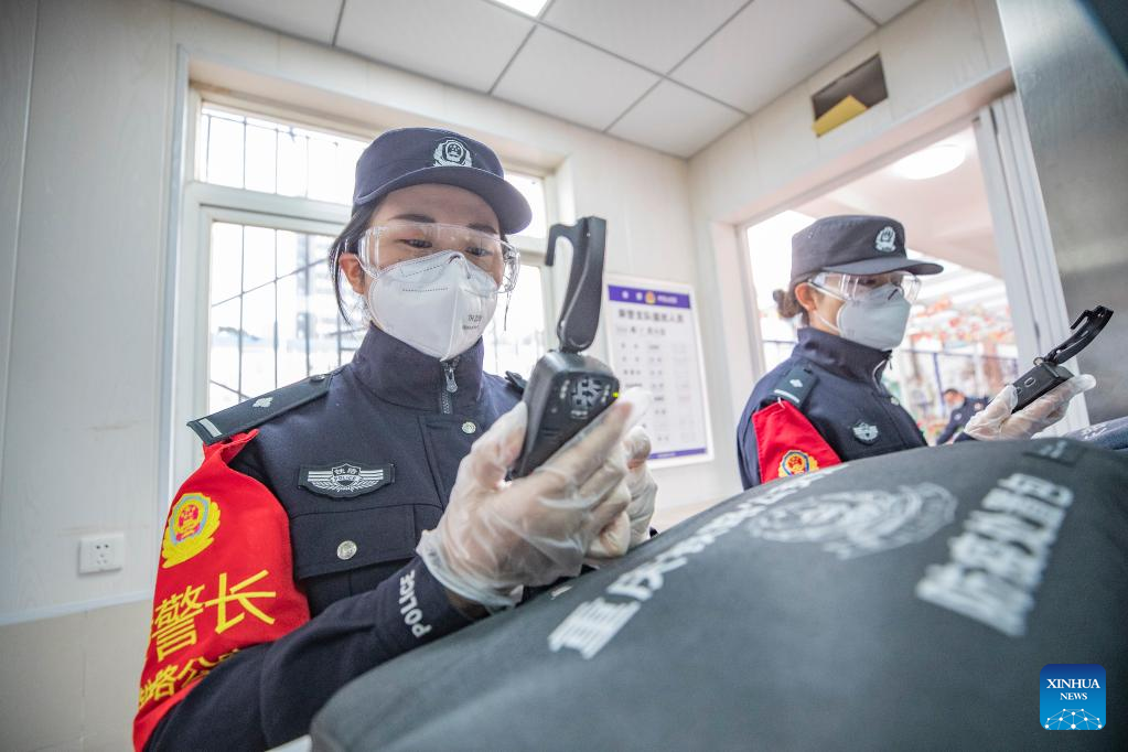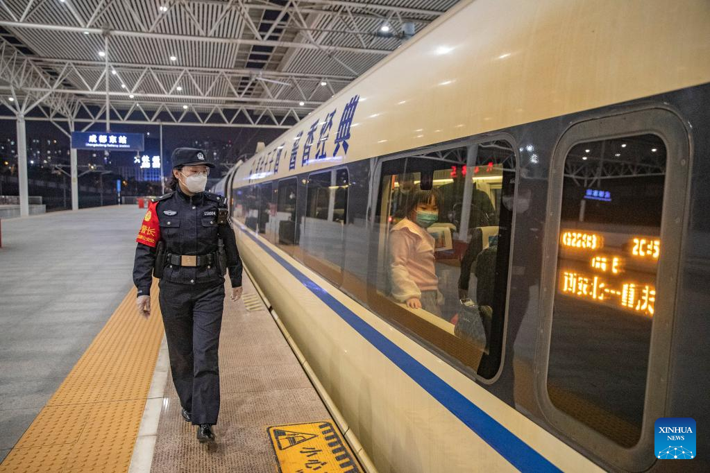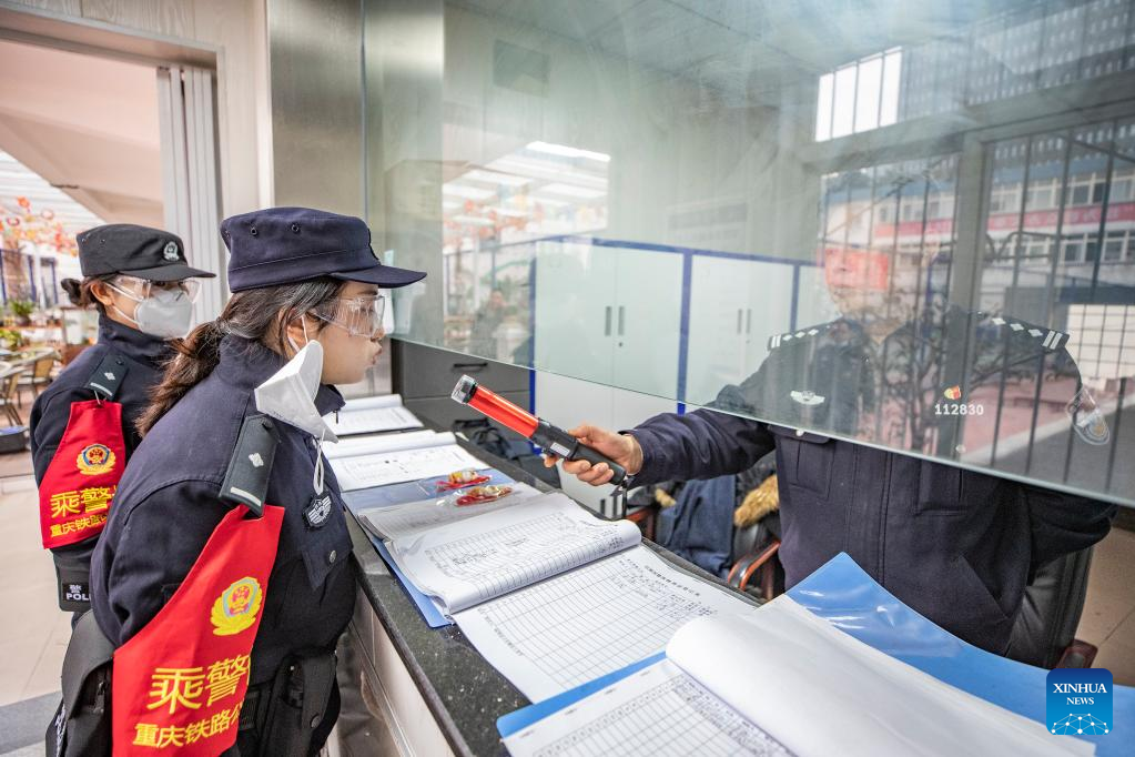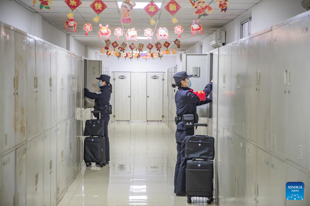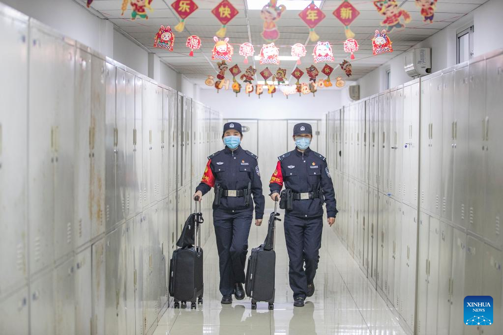 Li Hang, a member of the "Fanghua" female railway police officer unit, patrols outside train No.G2233 at Chengdu East Railway Station in Chengdu, southwest China's Sichuan Province, Jan. 18, 2023.