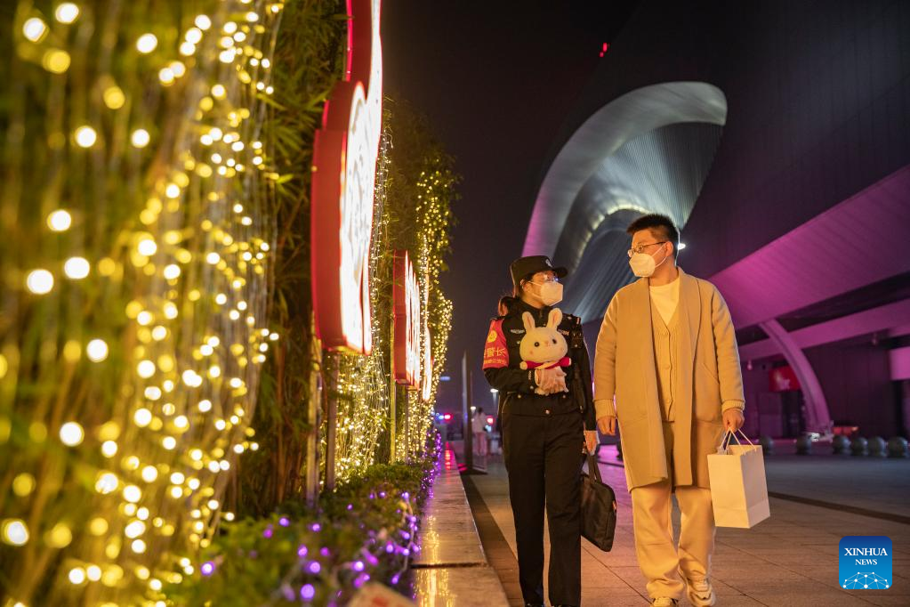 Li Hang (L), a member of the "Fanghua" female railway police officer unit, walks home with her husband after work at a square of Chongqing West Railway Station in Chongqing, southwest China, Jan. 18, 2023.