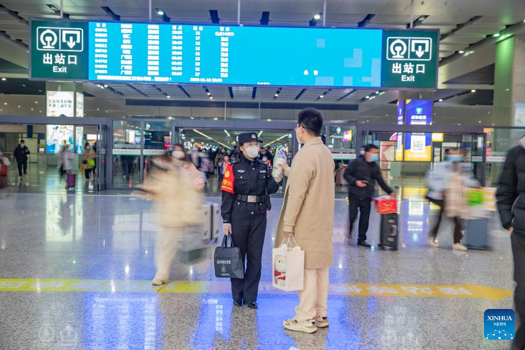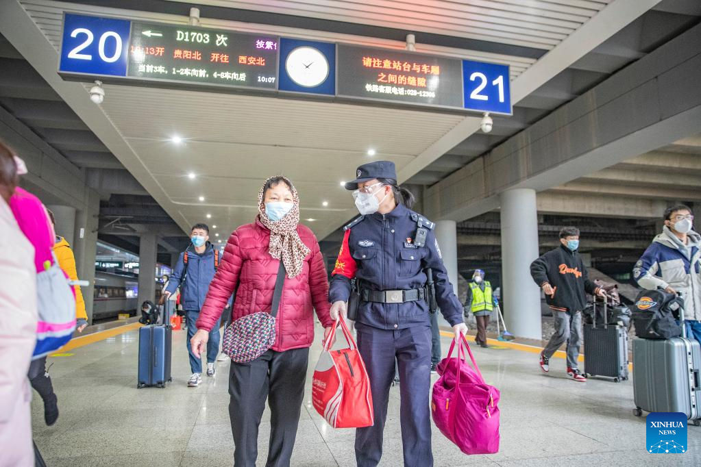 Zhu Xiaoli (R), a member of the "Fanghua" female railway police officer unit, helps a passenger with her luggage at Chongqing West Railway Station in Chongqing, southwest China, Jan. 16, 2023.