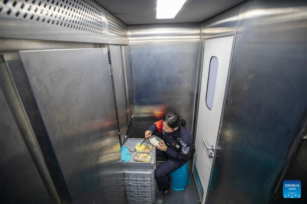 Zhu Xiaoli, a member of the "Fanghua" female railway police officer unit, has lunch aboard train No.D1703 which travels from Guiyang North Railway Station to Xi'an North Railway Station, after a patrol task on Jan. 16, 2023.