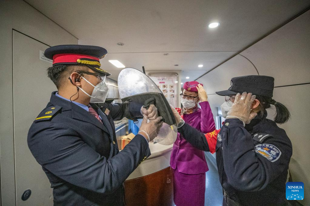 Zhu Xiaoli, a member of the "Fanghua" female railway police officer unit, patrols aboard train No.D1703 which travels from Guiyang North Railway Station to Xi'an North Railway Station, on Jan. 16, 2023.