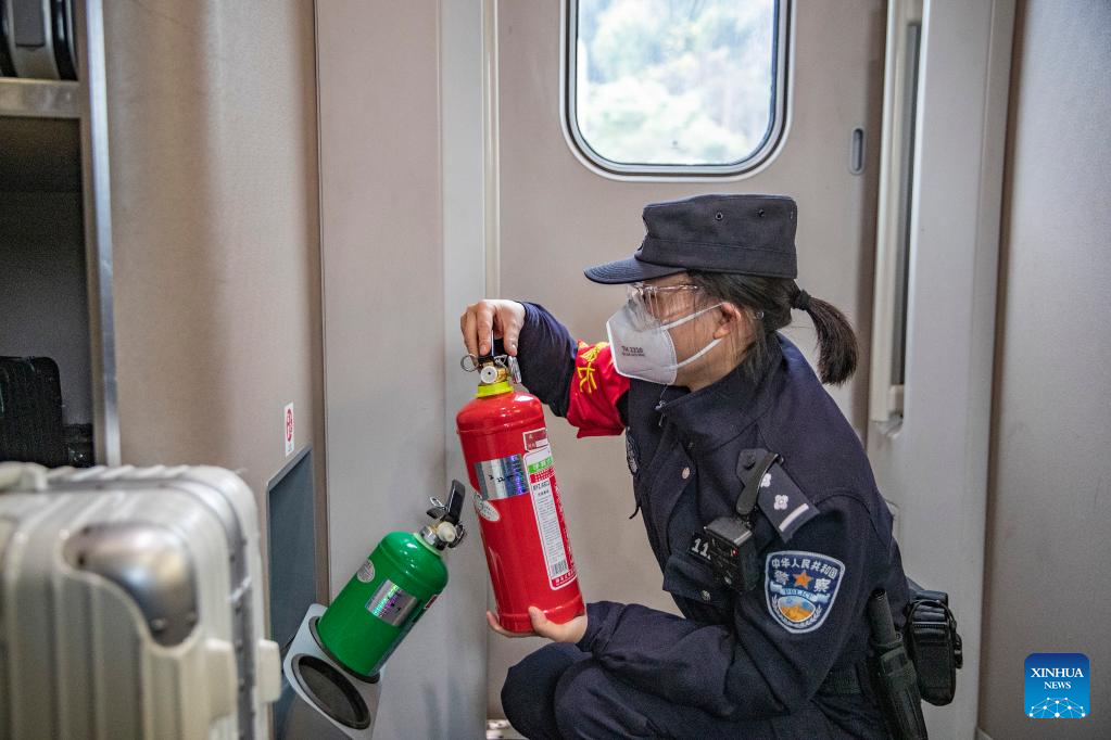 Zhu Xiaoli, a member of the "Fanghua" female railway police officer unit, checks fire extinguishers aboard train No.D1703 which travels from Guiyang North Railway Station to Xi'an North Railway Station, on Jan. 16, 2023.