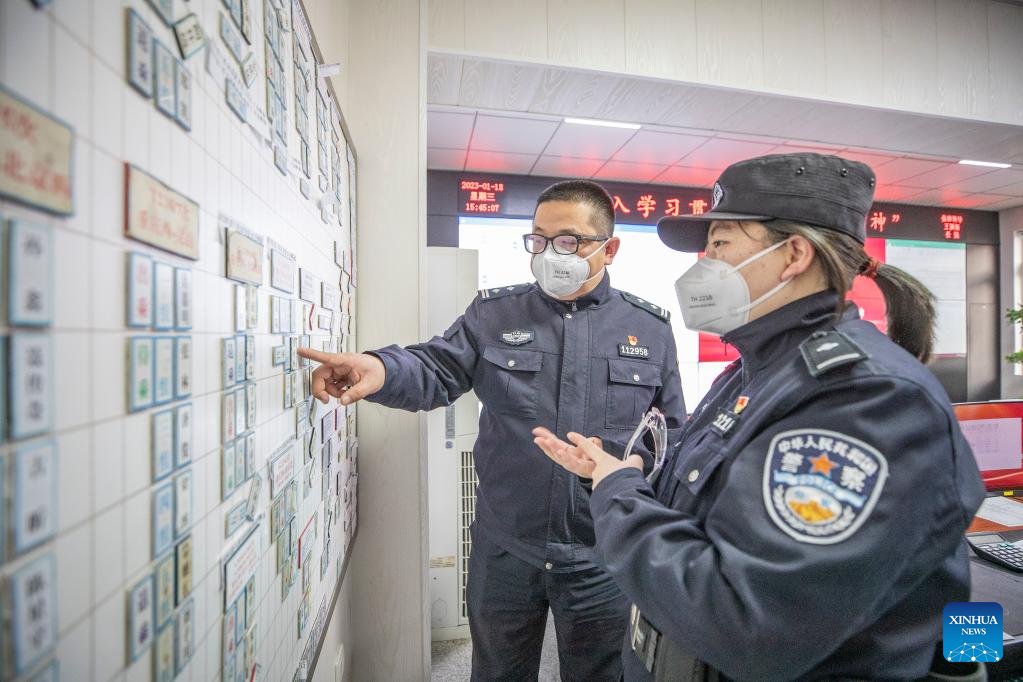 Su Yeping (R), a member of the "Fanghua" female railway police officer unit, talks with her colleague in Chongqing, southwest China, Jan. 18, 2023.