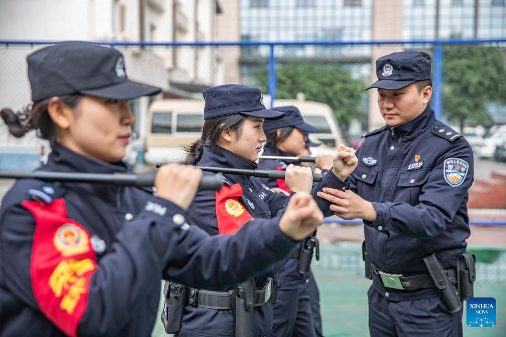 Members of the "Fanghua" female railway police officer unit take part in a training in Chongqing, southwest China, Jan. 18, 2023.