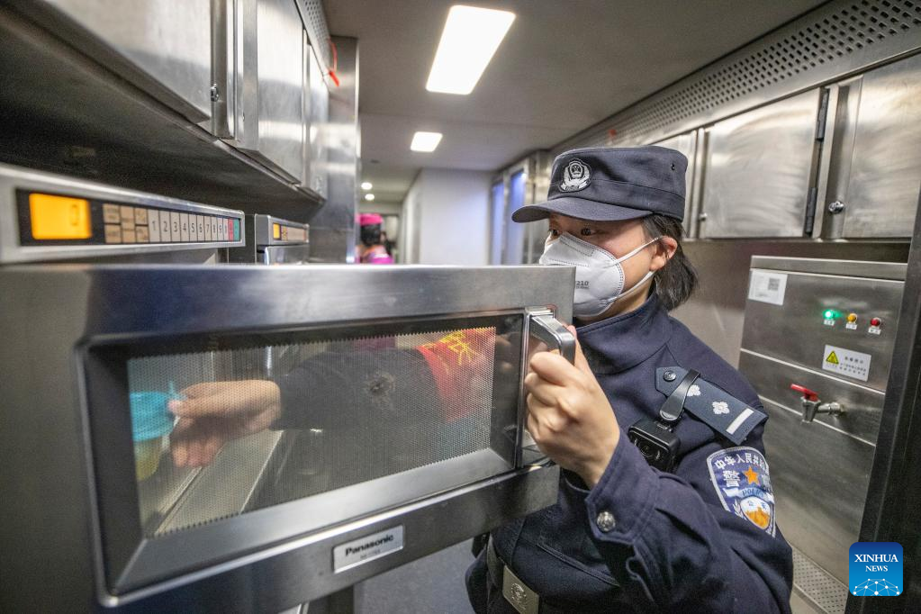 Zhu Xiaoli, a member of the "Fanghua" female railway police officer unit, heats her meal aboard train No.D1703 which travels from Guiyang North Railway Station to Xi'an North Railway Station, on Jan. 16, 2023.