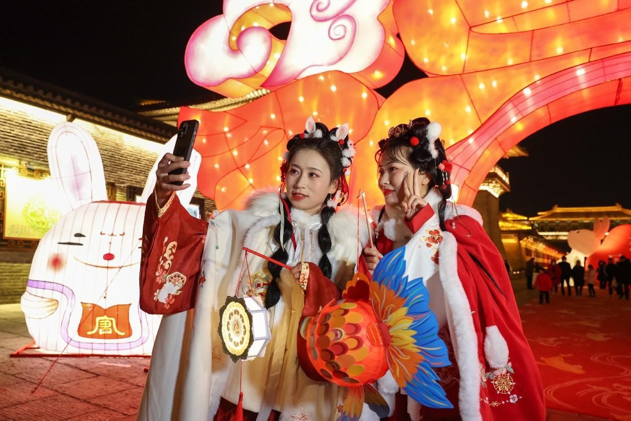 Tourists pose for pictures at a miaohui, literally a temple gathering or temple fair, in Xiangyang, central China's Hubei province, Jan. 18, 2023. (People's Daily Online/Yang Dong)