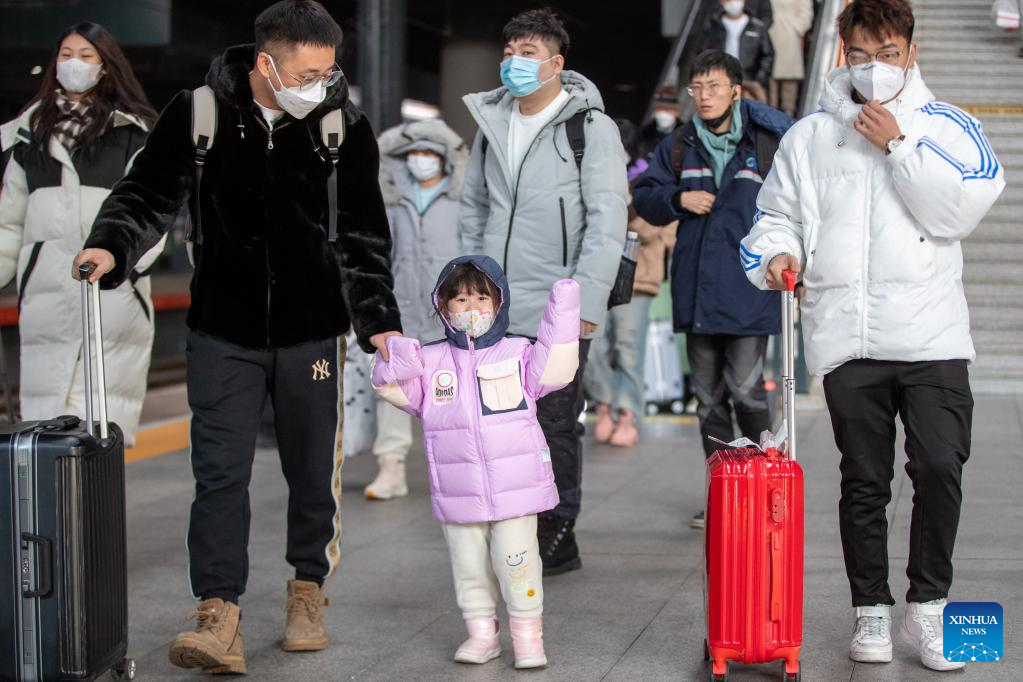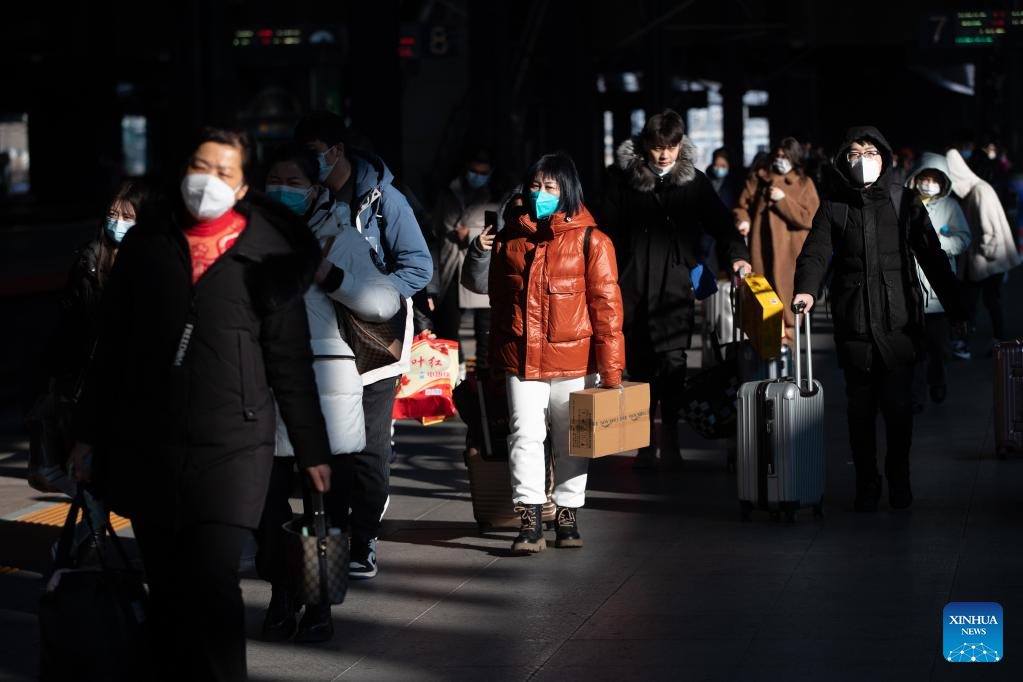Passengers walk on a platform inside the Harbin Railway Station in Harbin, northeast China's Heilongjiang Province, Jan. 20, 2023. Up to Jan. 18, a total of 1.612 million passenger trips have been made by the China Railway Harbin Bureau Group Co., Ltd. during this year's Spring Festival travel rush, up 68.8 percent year on year. (Xinhua/Zhang Tao)