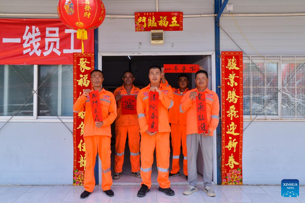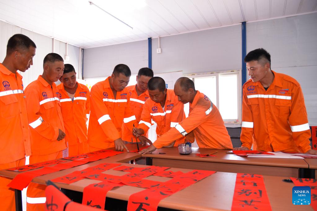 Construction workers of the Jakarta-Bandung High-Speed Railway display Spring Festival couplets after work in celebration of the upcoming Chinese Lunar New Year in Bekasi, Indonesia, Jan. 21, 2023. (Xinhua/Xu Qin)