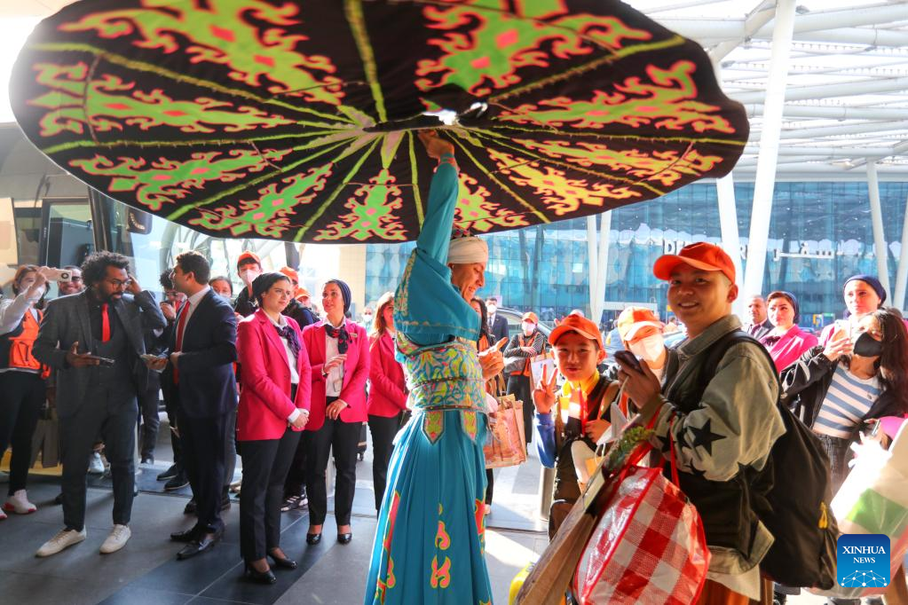 An Egyptian artist performs a traditional Egyptian folk dance to welcome Chinese tourists at the Cairo International Airport in Cairo, Egypt, Jan. 20, 2023. Ahead of the upcoming Chinese New Year, Egypt received the first Chinese tourist group on Friday since the outbreak of COVID-19 three years ago. (Xinhua/Sui Xiankai)