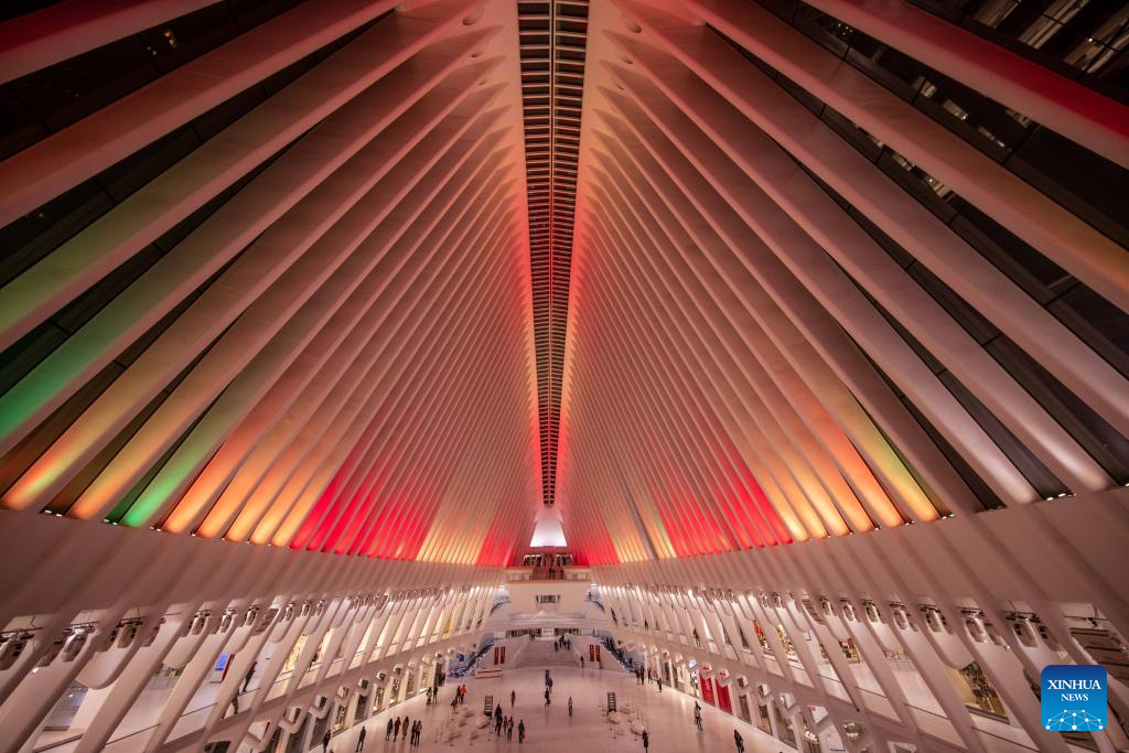 This photo taken on Jan. 20, 2023 shows the World Trade Center transportation hub lit up for the Chinese Lunar New Year, in New York, the United States. (Photo by Winston Zhou/Xinhua)