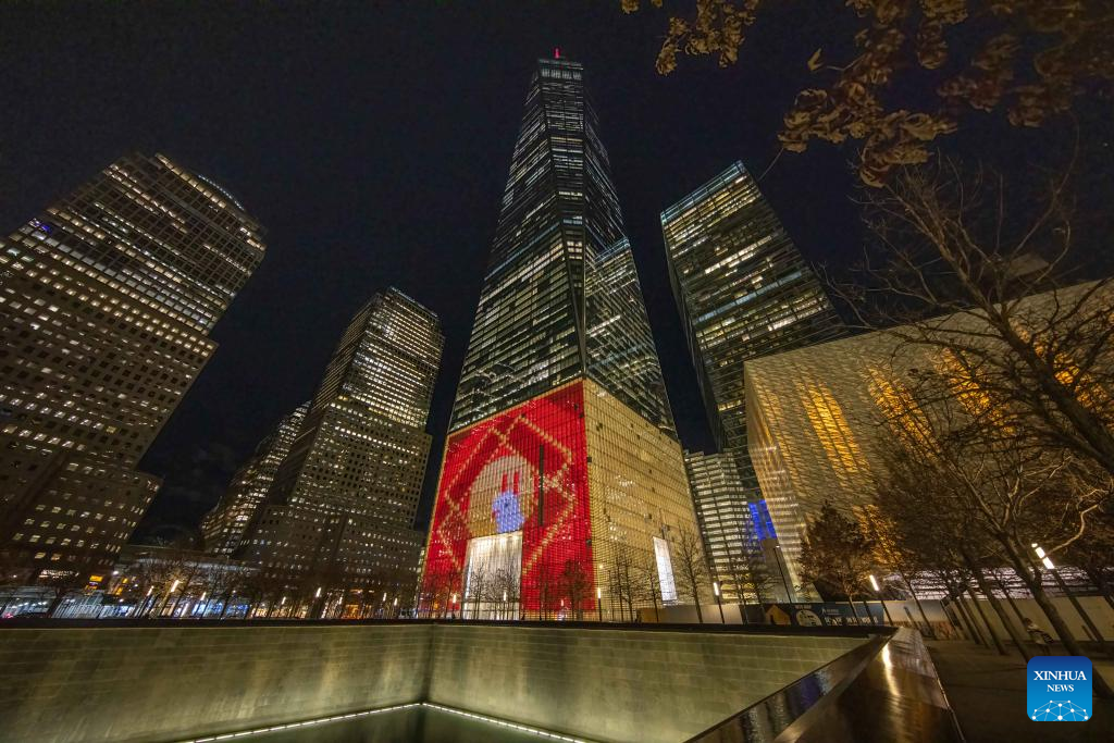 This photo taken on Jan. 20, 2023 shows One World Trade Center displaying patterns for Chinese Lunar New Year, in New York, the United States. (Photo by Winston Zhou/Xinhua)