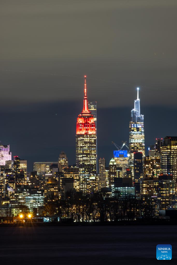 This photo taken on Jan. 20, 2023 shows the Empire State Building lit up in red for the Chinese Lunar New Year, in New York, the United States. (Photo by Winston Zhou/Xinhua)