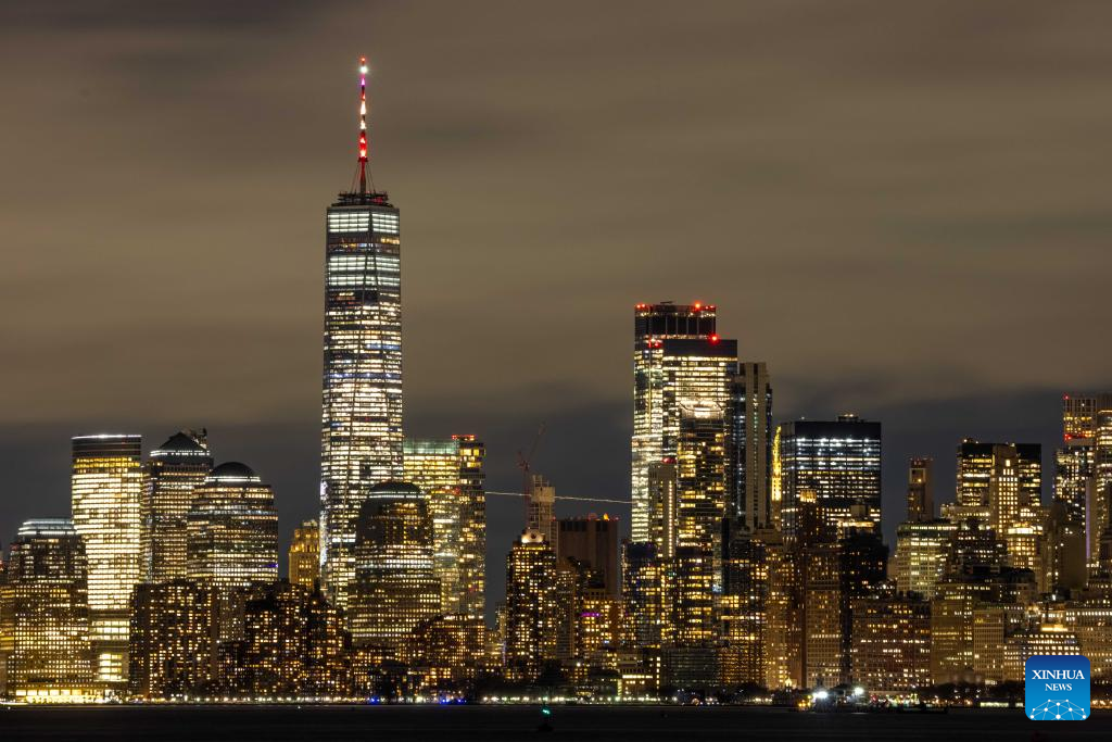 This photo taken on Jan. 20, 2023 shows the One World Trade Center lit up for the Chinese Lunar New Year, in New York, the United States. (Photo by Winston Zhou/Xinhua)
