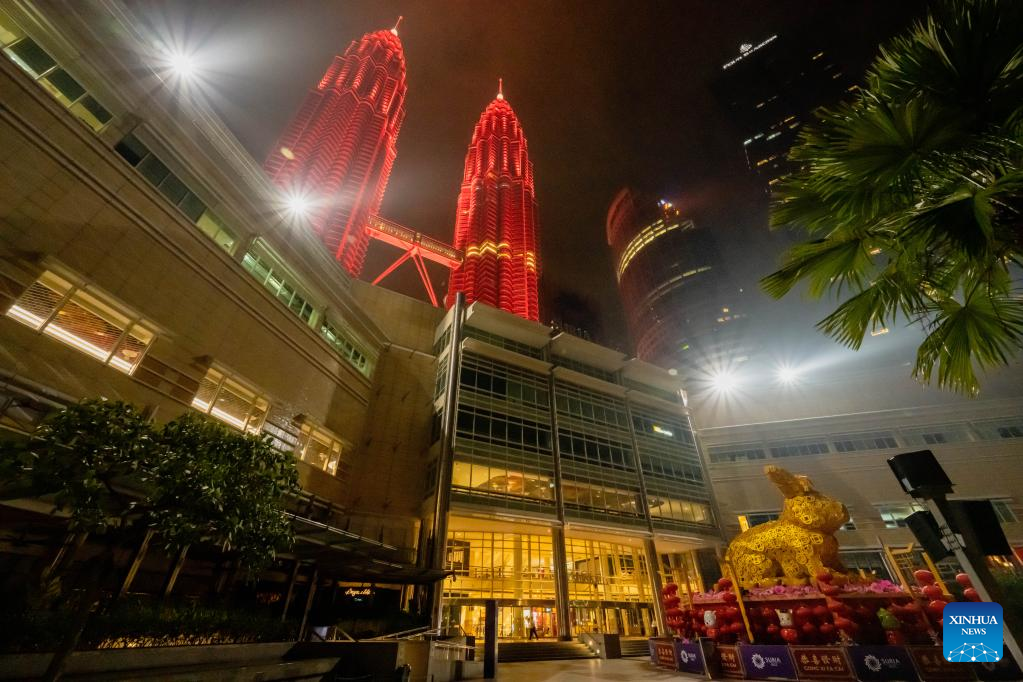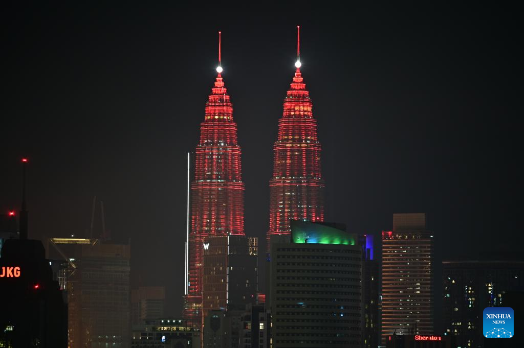 The Petronas Twin Towers are illuminated in red in celebration of the Chinese New Year in Kuala Lumpur, Malaysia, Jan. 22, 2023. (Xinhua/Zhu Wei)
