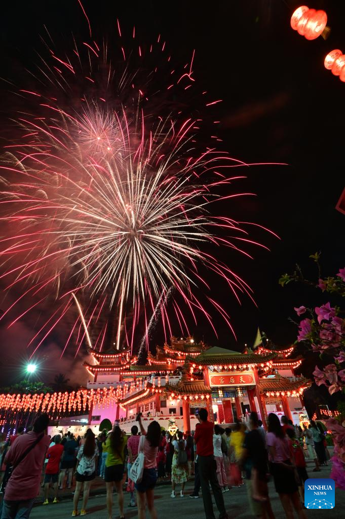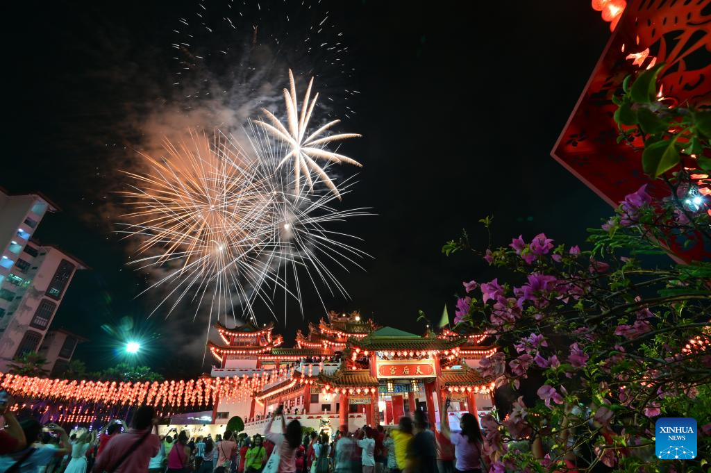 Fireworks spark over the Thean Hou Temple in celebration of the Chinese New Year in Kuala Lumpur, Malaysia, Jan. 22, 2023. (Photo by Chong Voon Chung/Xinhua)