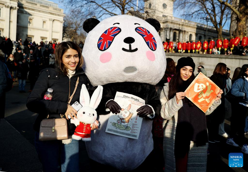 People pose for photos during the Chinese New Year celebration at Trafalgar Square in London, Britain, Jan. 22, 2023. (Xinhua/Li Ying)
