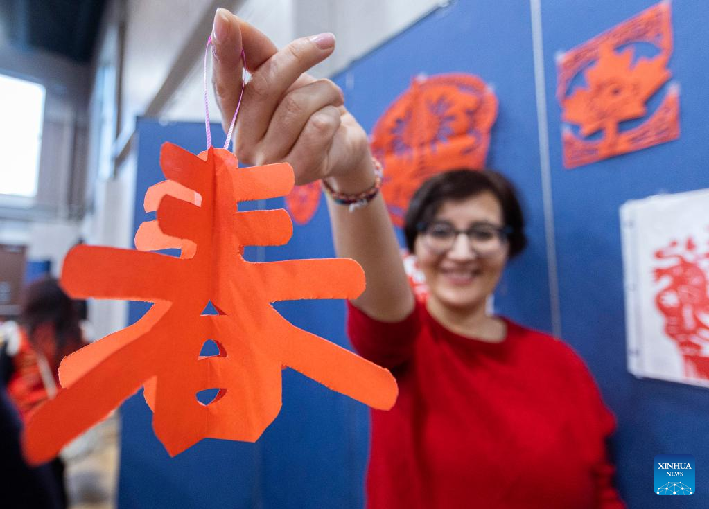 A woman shows her paper-cutting work during an event to celebrate the Chinese New Year at the Chinese Cultural Center of Greater Toronto in Toronto, Canada, on Jan. 22, 2023. (Photo by Zou Zheng/Xinhua)