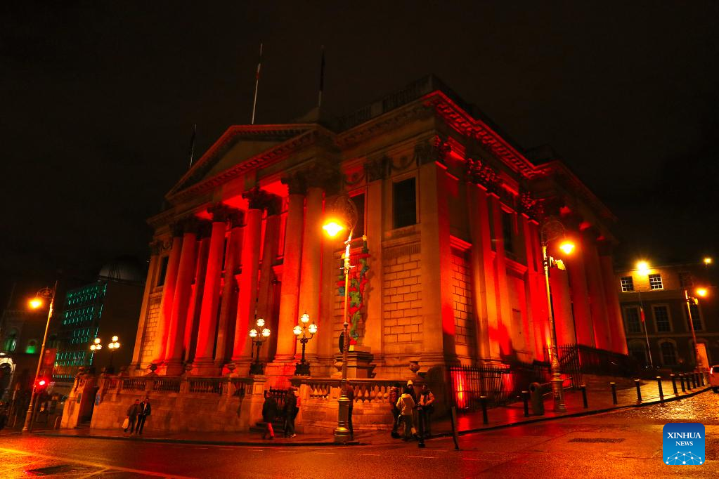This photo taken on Jan. 22, 2023 shows the city hall of Dublin lit up in red to celebrate the Chinese New Year in Dublin, Ireland. (Photo by Liu Xiaoming/Xinhua)