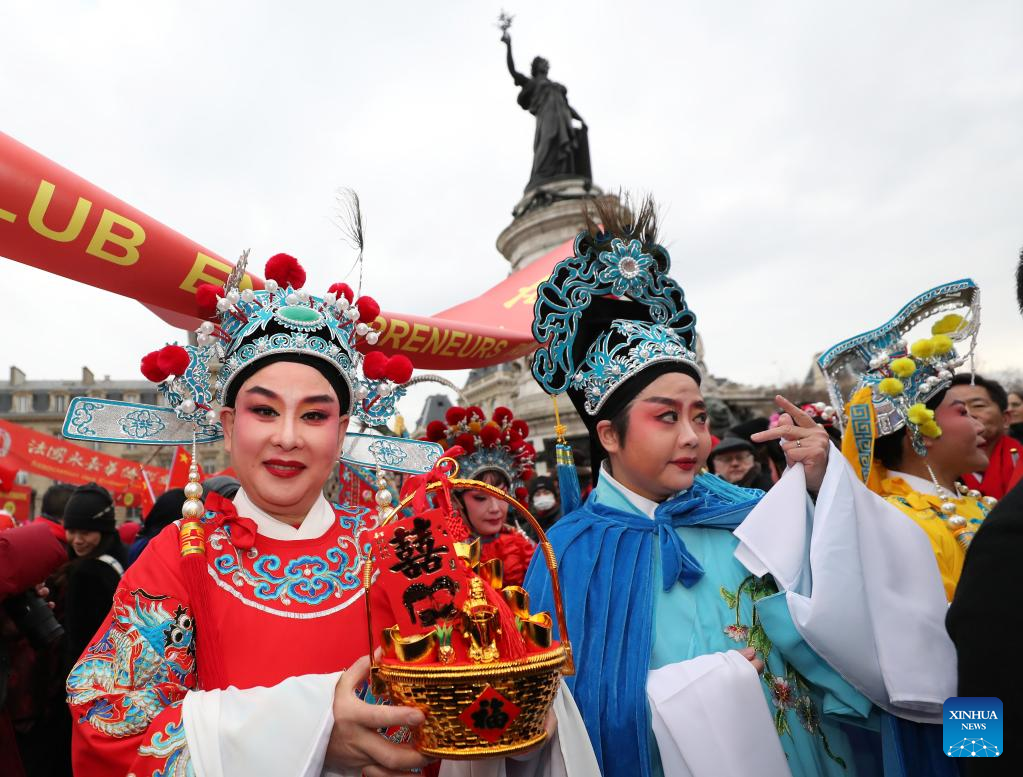 People participate in the Chinese New Year parade in Paris, France, on Jan. 22, 2023. (Xinhua/Gao Jing)