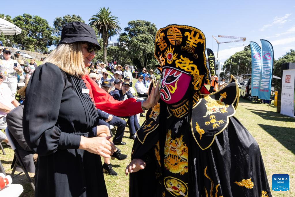 A Chuanju (Sichuan opera) performer interacts with a woman during a carnival celebrating the Chinese New Year in Auckland, New Zealand, Jan. 22, 2023. (Photo by Sun Xueliang/Xinhua)