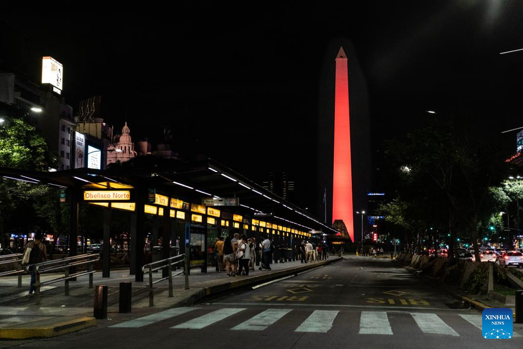 This photo taken on Jan. 22, 2023 shows the Obelisk lit up in red to celebrate the Chinese New Year in Buenos Aires, Argentina. (Photo by Martin Sabala/Xinhua)