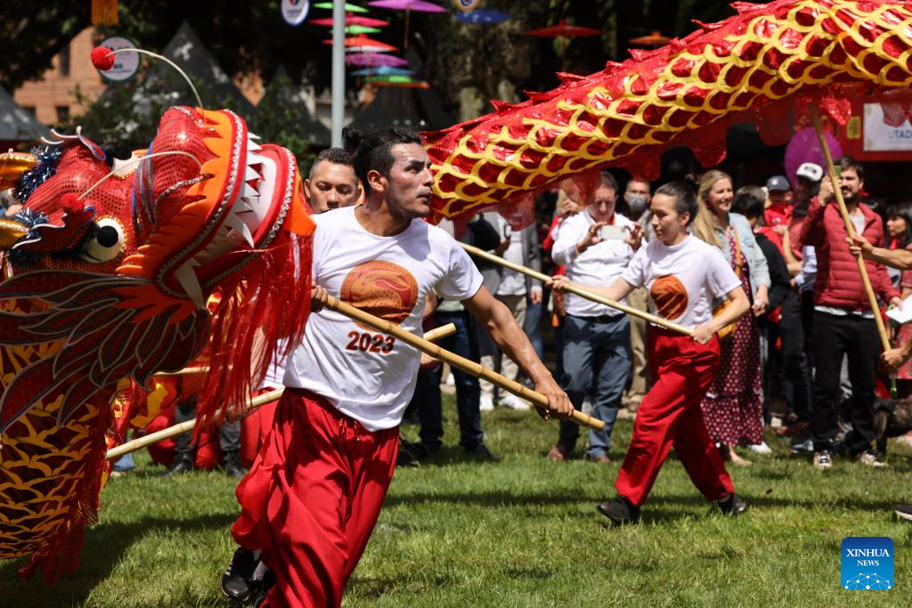 People perform dragon dance to celebrate the Chinese New Year in Bogota, Colombia, Jan. 22, 2023. (Xinhua/Zhou Shengping)