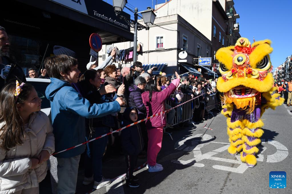 People watch a lion dance performance during a parade celebrating the Chinese New Year in Madrid, Spain, Jan. 22, 2023. (Photo by Gustavo Valiente/Xinhua)