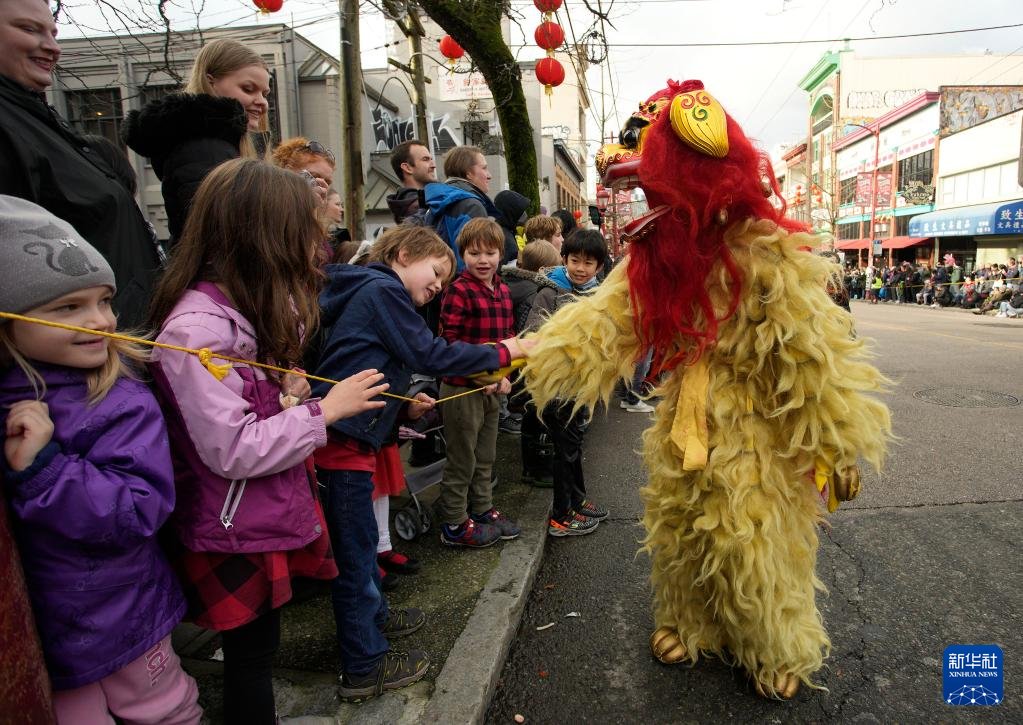 A performer dressed in a lion dance costume interacts with the crowd during a parade in celebration of the Chinese New Year in Vancouver, Canada, Jan. 22, 2023. (Photo by Liang Sen/Xinhua)