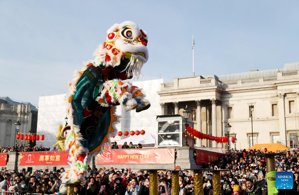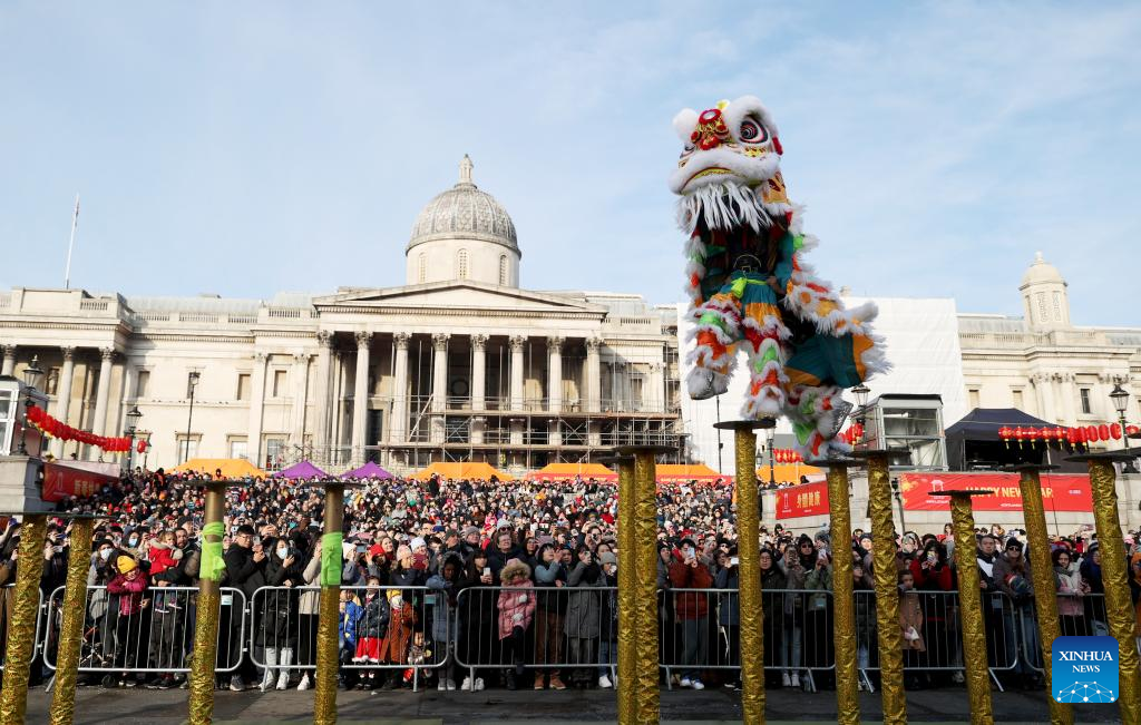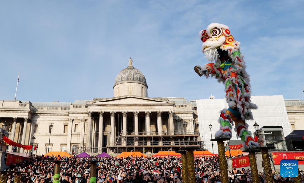 Lion dance performers perform on poles during the Chinese New Year celebration at Trafalgar Square in London, Britain, Jan. 22, 2023. (Xinhua/Li Ying)