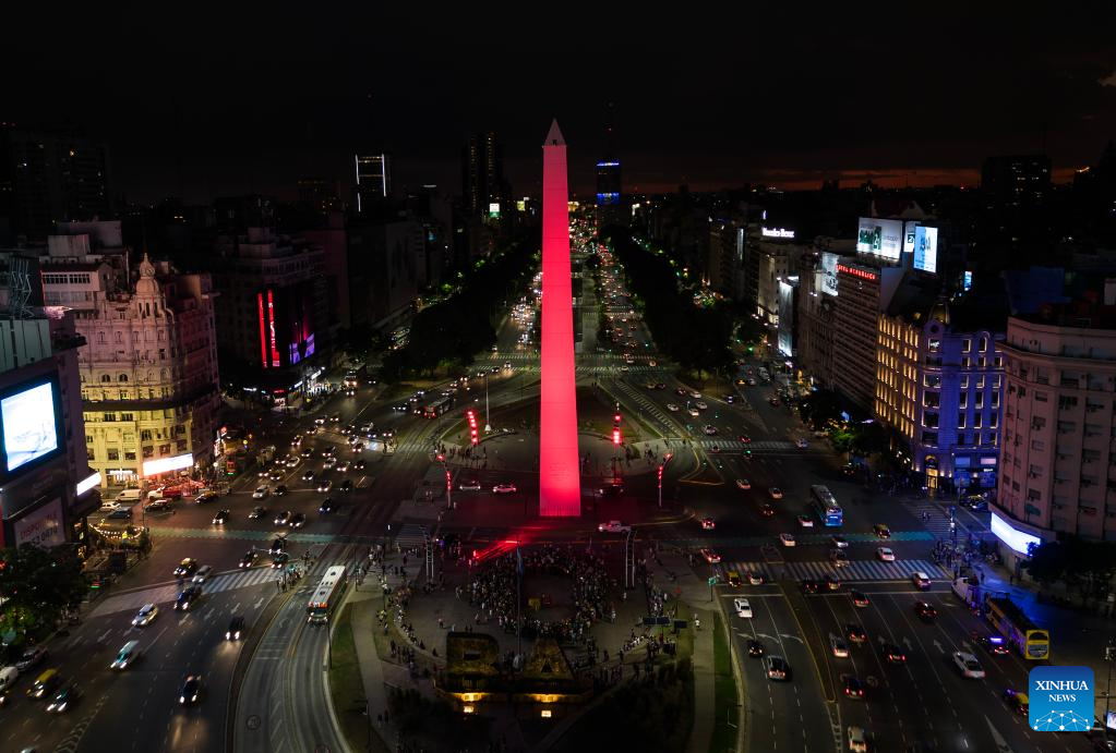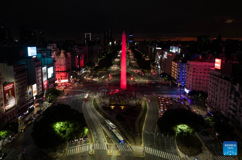 This aerial photo taken on Jan. 22, 2023 shows the Obelisk lit up in red to celebrate the Chinese New Year in Buenos Aires, Argentina. (Photo by Martin Sabala/Xinhua)