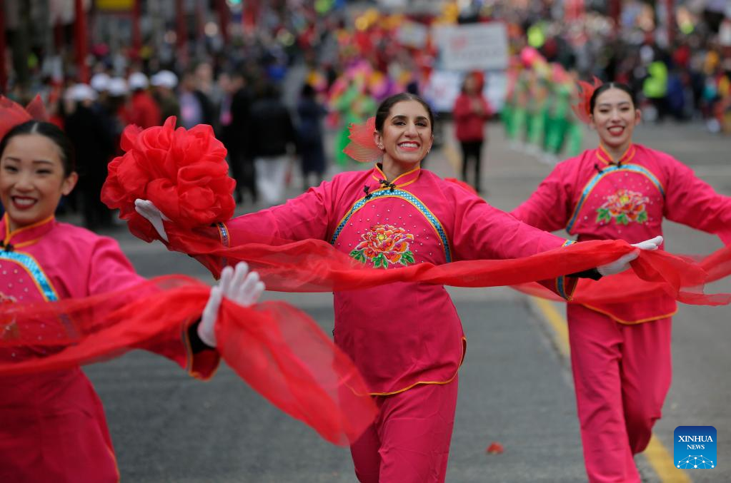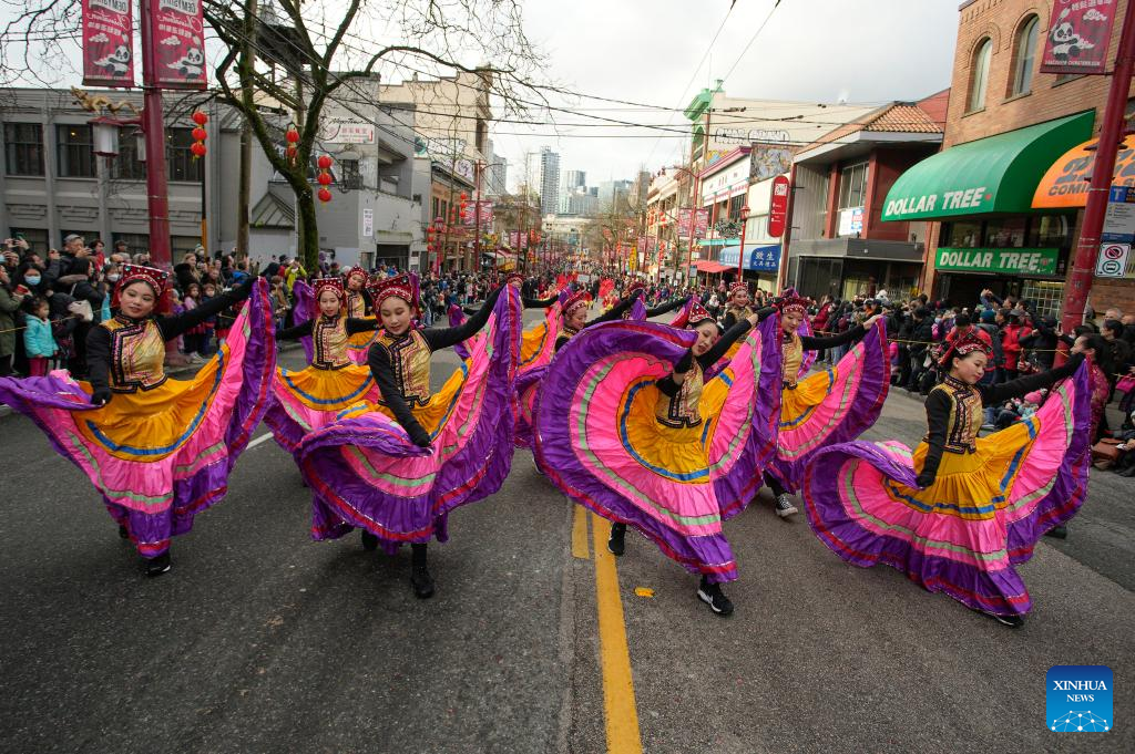 Dancers perform during a parade in celebration of the Chinese New Year in Vancouver, Canada, Jan. 22, 2023. (Photo by Liang Sen/Xinhua)