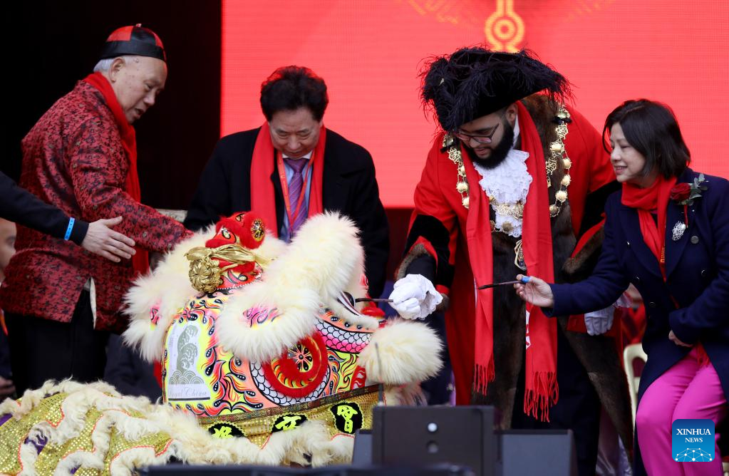 Guests dot the "eyes" of a lion dance costume during the Chinese New Year celebration at Trafalgar Square in London, Britain, Jan. 22, 2023. (Xinhua/Li Ying)