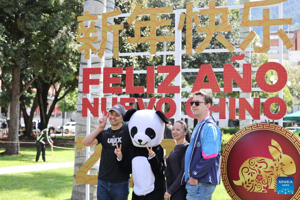 People pose for photos during celebrations of the Chinese New Year in Bogota, Colombia, Jan. 22, 2023. (Xinhua/Zhou Shengping)