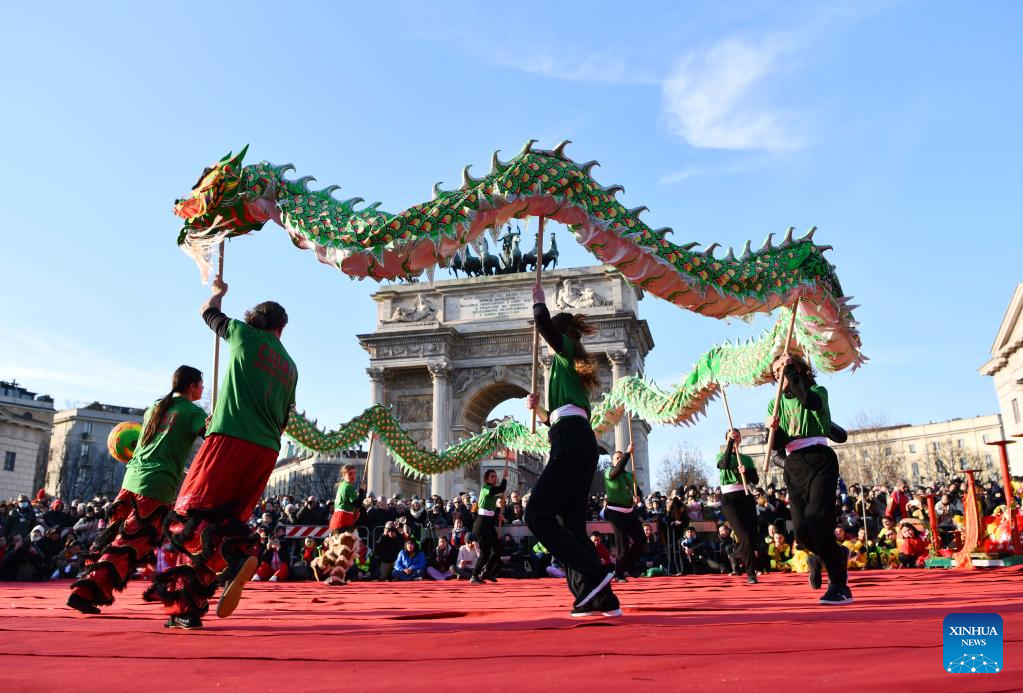 People perform dragon dance in celebration of the Chinese New Year in Milan, Italy, Jan. 22, 2023. (Xinhua/Jin Mamengni)