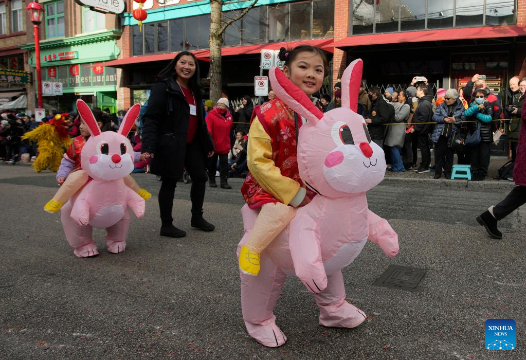 Children put on rabbit costumes during a parade in celebration of the Chinese New Year in Vancouver, Canada, Jan. 22, 2023. (Photo by Liang Sen/Xinhua)