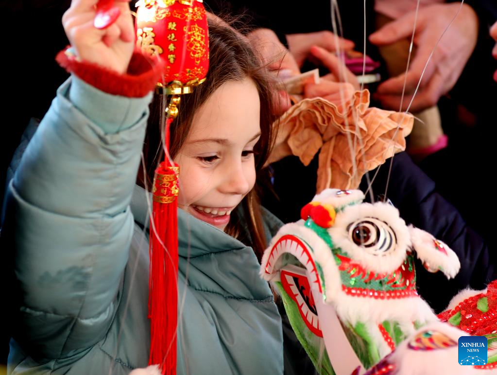 A child holds a lion dance toy during the Chinese New Year celebration at Trafalgar Square in London, Britain, Jan. 22, 2023. (Xinhua/Li Ying)
