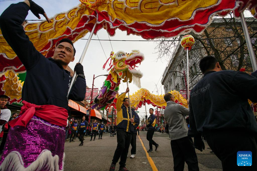 People perform dragon dance during a parade in celebration of the Chinese New Year in Vancouver, Canada, Jan. 22, 2023. (Photo by Liang Sen/Xinhua)