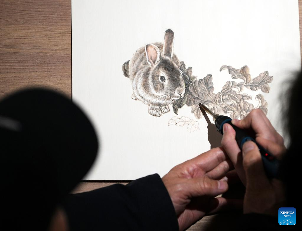 An artist teaches a kid to create a pyrography work of rabbit in Xinhua District of Shijiazhuang, north China's Hebei Province, Jan. 12, 2023.