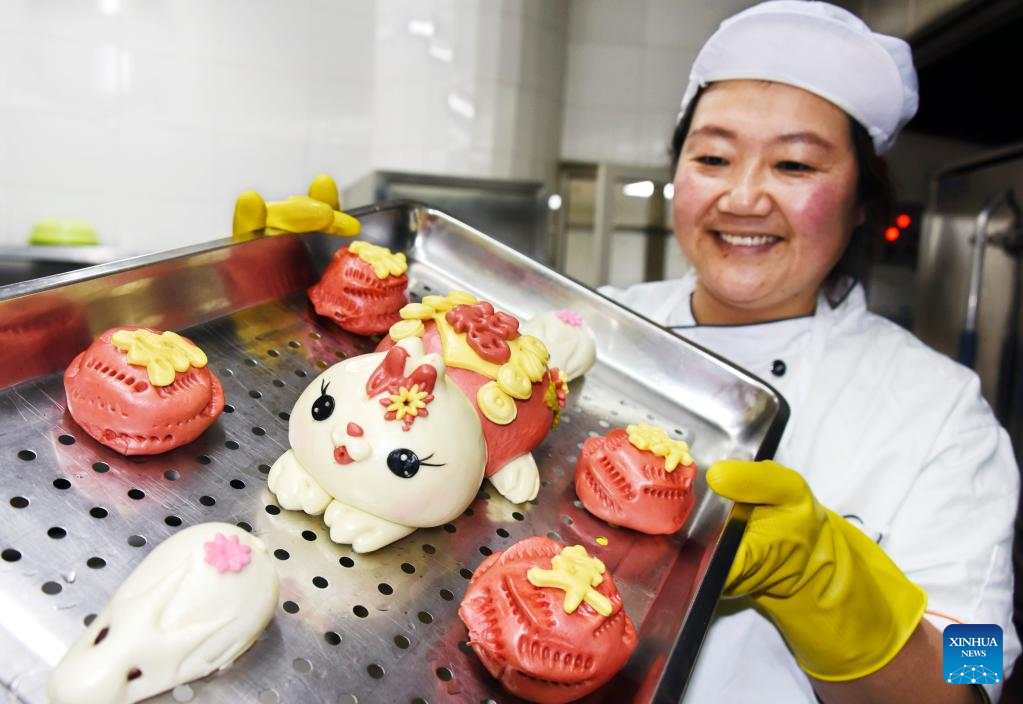 A cook displays rabbit-shaped steamed bread at Qingdao Polar Ocean Park in Qingdao, east China's Shandong Province, Jan. 18, 2023.