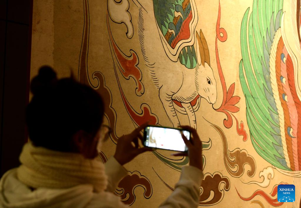 A visitor takes photos of a rabbit depicted on a mural in a mural exhibition hall of Hebei Museum in Shijiazhuang, north China's Hebei Province, Jan. 23, 2023. The Chinese New Year for 2023 marks the Year of the Rabbit -- a gentle and beloved animal that signifies vitality, wittiness, cautiousness and good luck in the Chinese zodiac. (Photo by Chen Qibao/Xinhua)