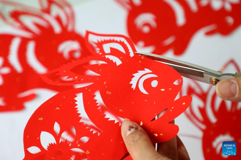 A folk artist creates rabbit-themed paper cutting works in Lizhuang Town, Huimin County, Binzhou City, east China's Shandong Province, Jan. 13, 2023. The Chinese New Year for 2023 marks the Year of the Rabbit -- a gentle and beloved animal that signifies vitality, wittiness, cautiousness and good luck in the Chinese zodiac. (Photo by Chu Baorui/Xinhua)